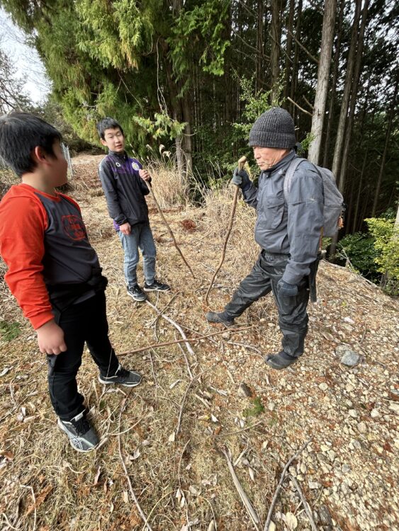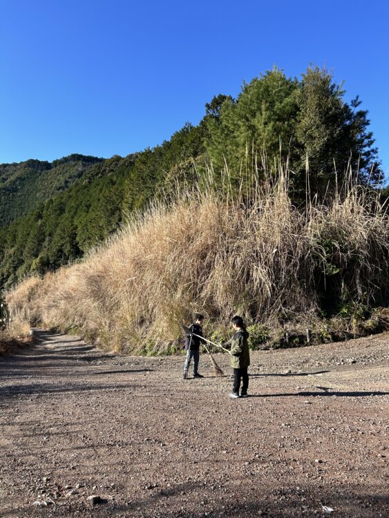 子どもたちは、竹ぼうきと熊手を持って歩いていきました。
