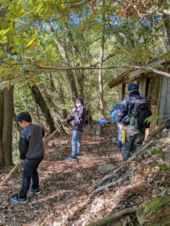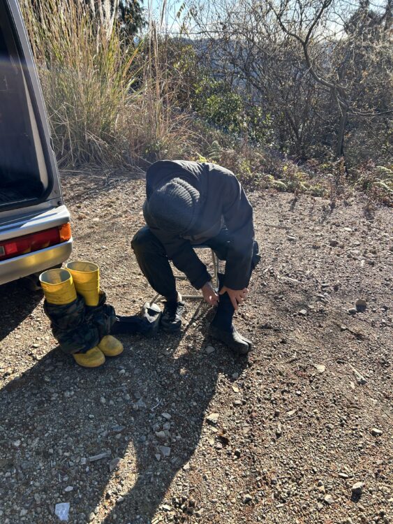 地下足袋をはいて、腰にはナタやノコギリを構えています。