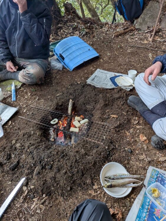 お宮の前に穴を掘って、火を熾し、おもちや魚を炙って食べたようです。