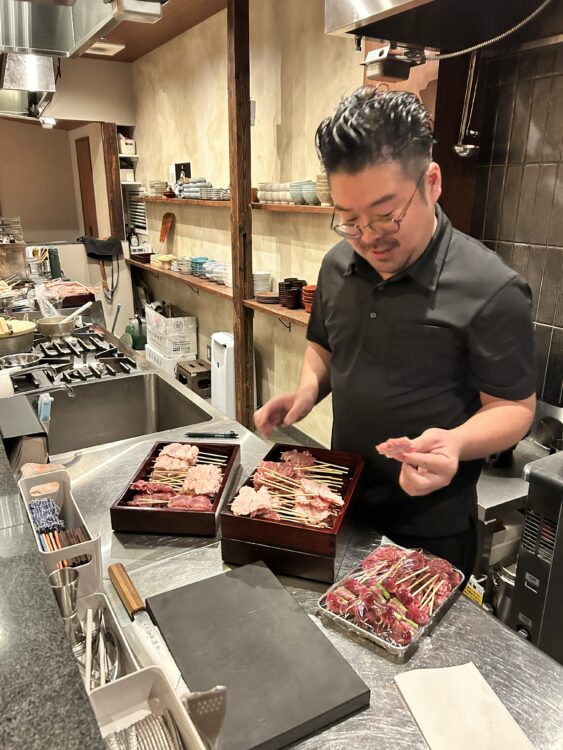 土佐ジローを細かく分解して、串にさして。
